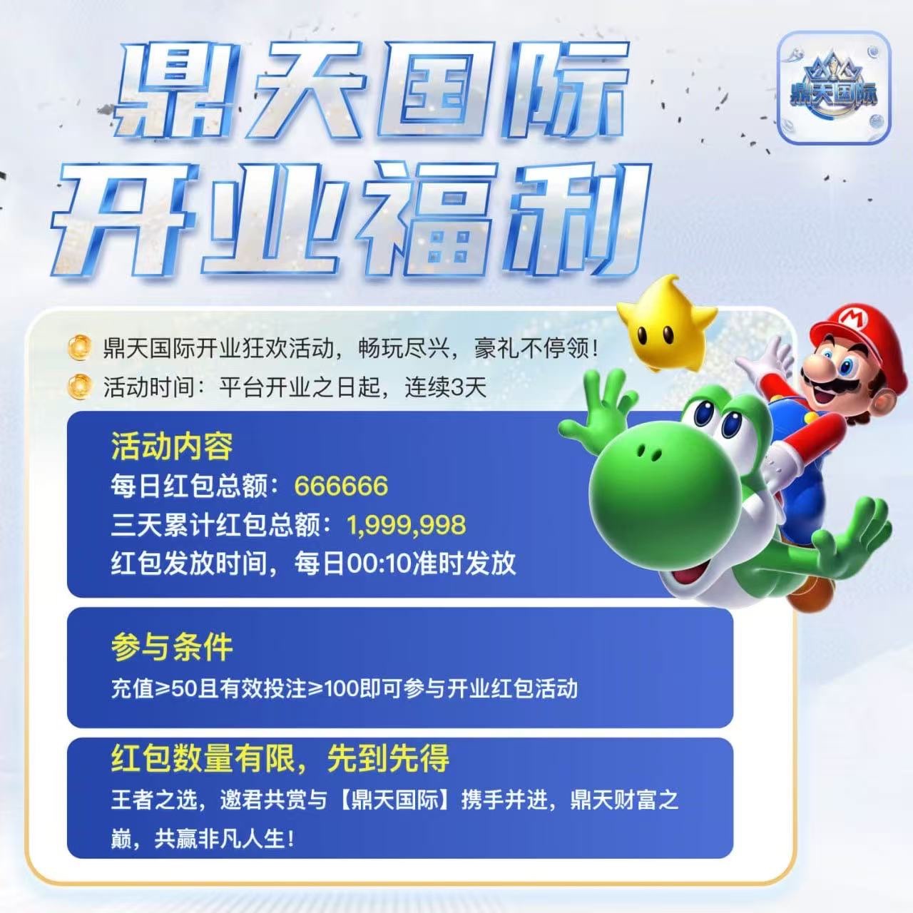 ✅开业连续3日红包雨,充值50流水100可领取